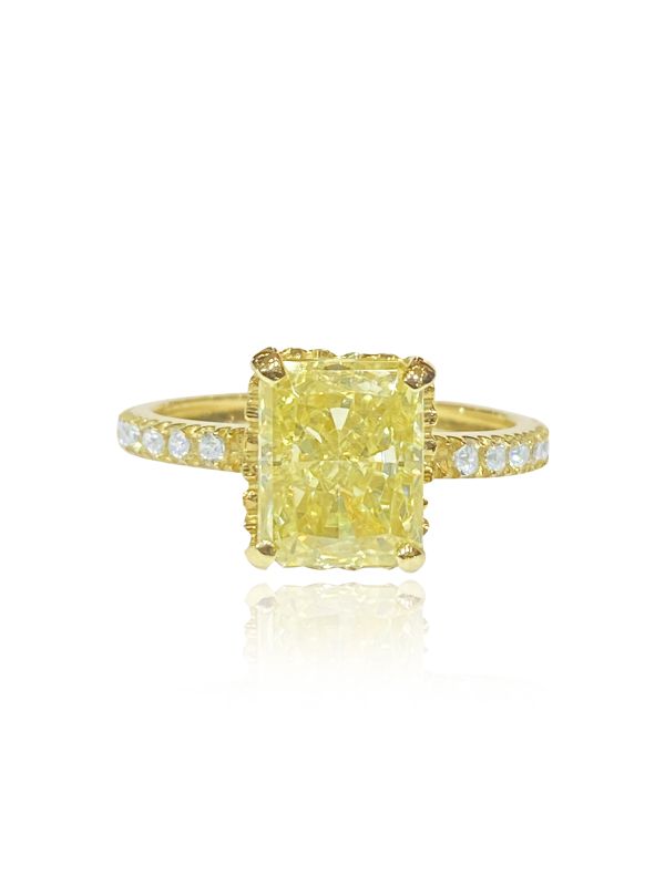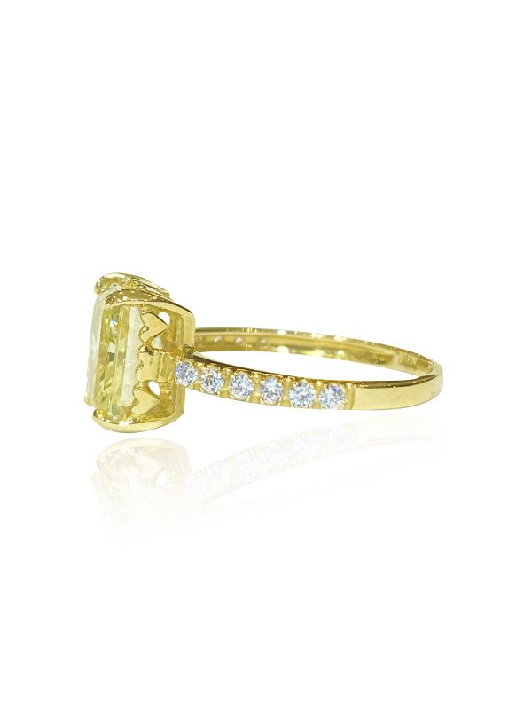 Δαχτυλίδι σε κίτρινο χρυσό 14Κ με μία εντυπωσιακή κίτρινη πέτρα στο κέντρο σε κοπή emerald. Στα στηρίγματα της πέτρας υπάρχουν λεπτομέρειες από χρυσές καρδιές, που προσδίδουν μία νότα ρομαντισμού στο κόσμημα. Οι πλαϊνές πέτρες ζιργκόν προσθέτουν επιπλέων λάμψη.