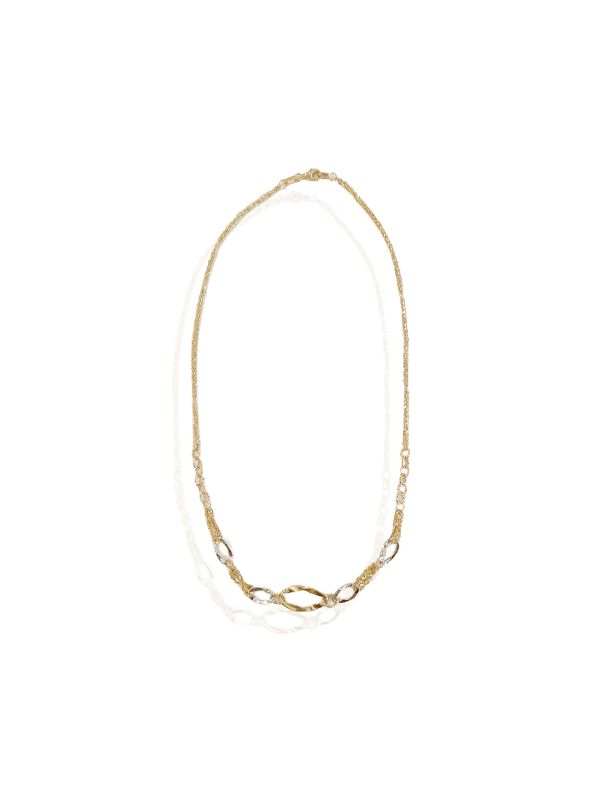 Ένα εντυπωσιακό και κομψό κολιέ από χρυσό 14Κ, με αλυσίδα και κρίκους σε συνδυασμό κίτρινου και λευκού χρυσού. Η αρμονική εναλλαγή των δύο αποχρώσεων δημιουργεί ένα διακριτικό αλλά ξεχωριστό αποτέλεσμα.
