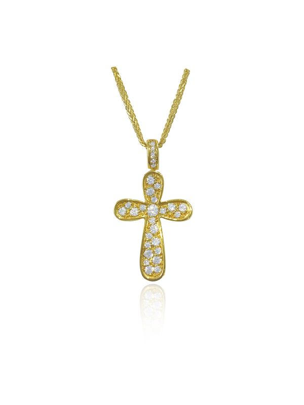 Σταυρός γυναικείος από κίτρινο χρυσό 14Κ διακοσμημένος με πέτρες σε όλη την επιφάνεια, που του χαρίζουν λάμψη και πολυτέλεια. 'Ενα διαχρονικό κόσμημα με έντονο συμβολισμό πίστης και κομψότητας. Συνοδεύεται από χρυσή αλυσίδα 14Κ. Η τιμή του σταυρού είναι στα 690,00 ευρώ και της αλυσίδας στα 650,00 ευρώ.