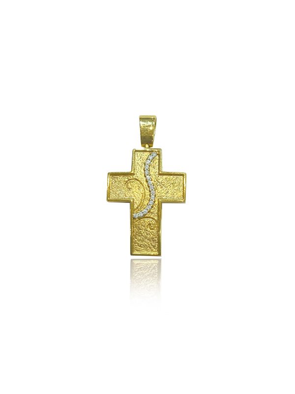 Σταυρός γυναικείος από κίτρινο χρυσό 9Κ με ιδιαίτερο σχεδιασμό. Η επιφάνεια του διαθέτει ανάγλυφη υφή, ενώ στο κέντρο μία καμπύλη απο΄πέτρες ζιργκόν, προσθέτουν λάμψη και φινέτσα.